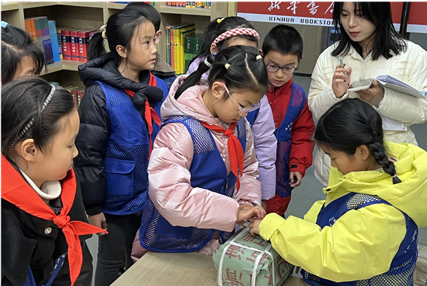 在新華書店鏡湖分店店長(cháng)簡短介紹後(hòu),小隊員們圍坐在大書桌兩(liǎng)側,組成(chéng)了4支小分隊,完成(chéng)了圖書整理歸架、圖書查詢上架、圖書打包、圖書出售等體驗項目。